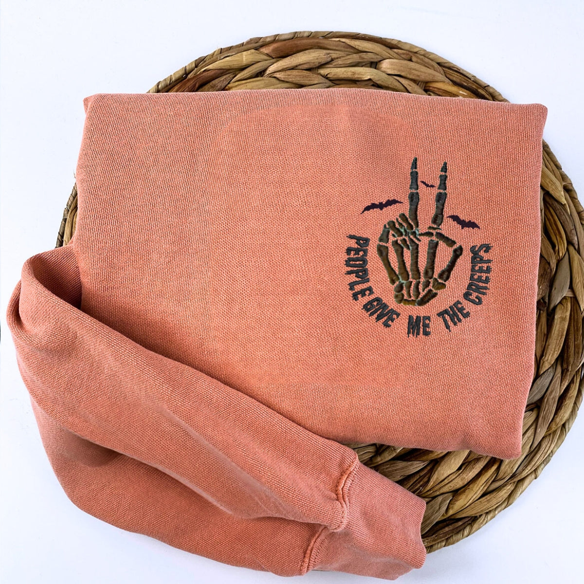 This unique and playful sweatshirt features an intricately embroidered skeleton hand alongside the cheeky phrase "People Give Me The Creeps." It’s the perfect piece for anyone who loves a bit of humor with their Halloween style.