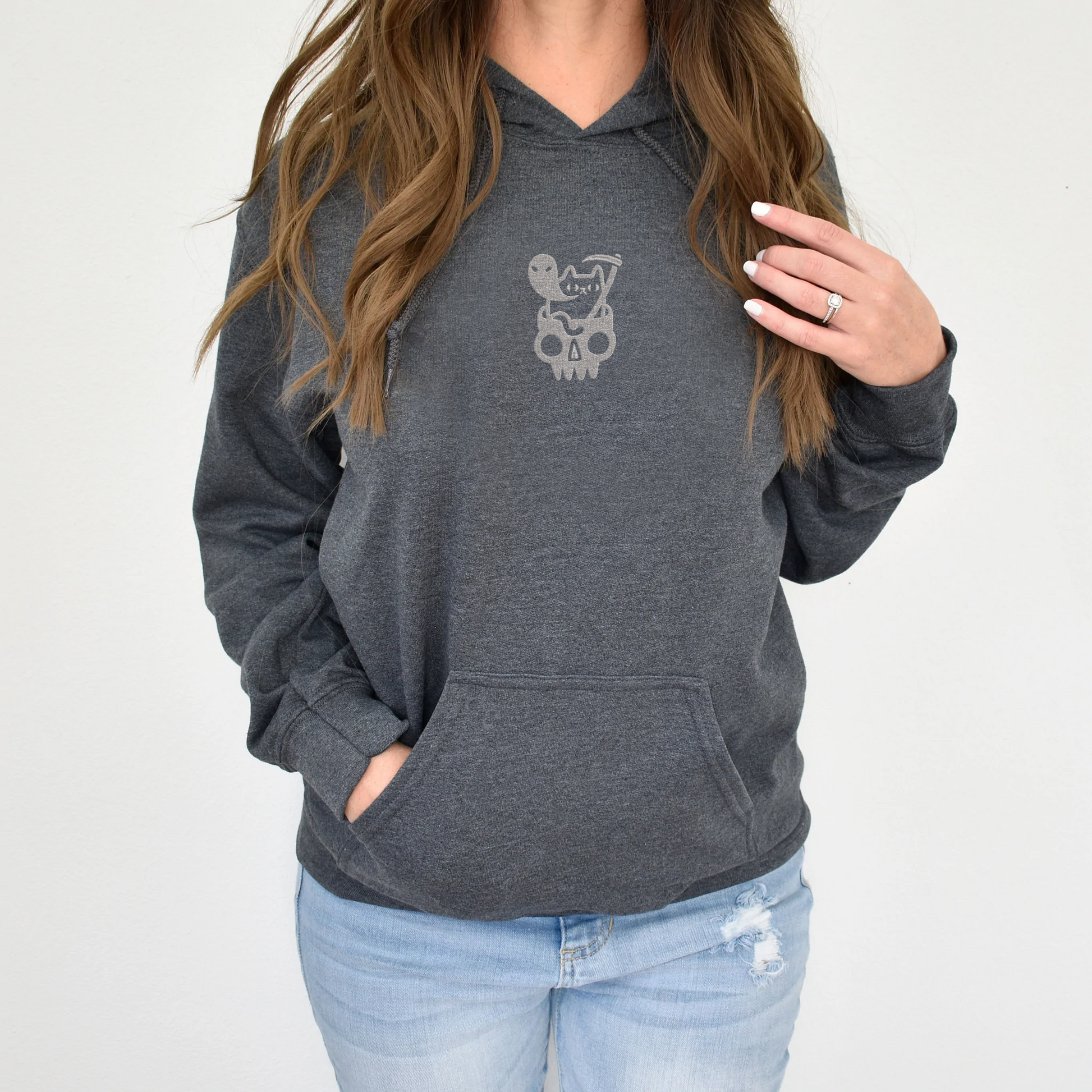 🎃 Embrace the Doom Cat: Step into the shadows with our Doom Cat design, beautifully embroidered onto the sweatshirt. This enigmatic feline brings an aura of mystery and intrigue, making it a captivating addition to your Halloween wardrobe.